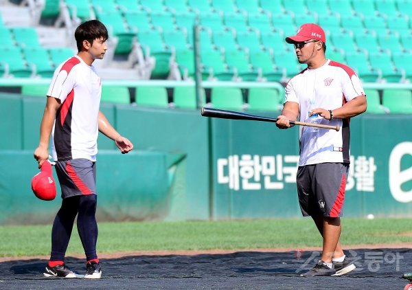 경기 전 SK 강승호가 정경배 코치와 이야기를 나누고 있다.