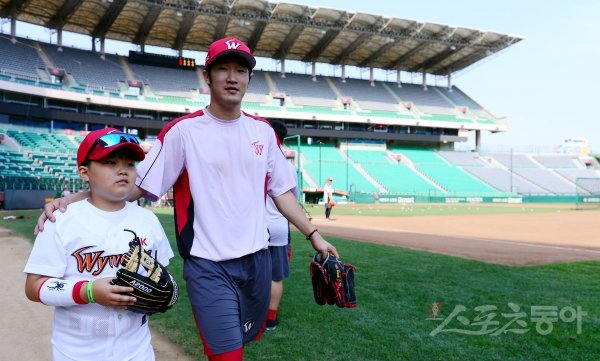 경기에 앞서 야구선수를 꿈꾸는 소아암 환우 김진욱이 박종훈의 안내를 받으며 그라운드를 걷고 있다.