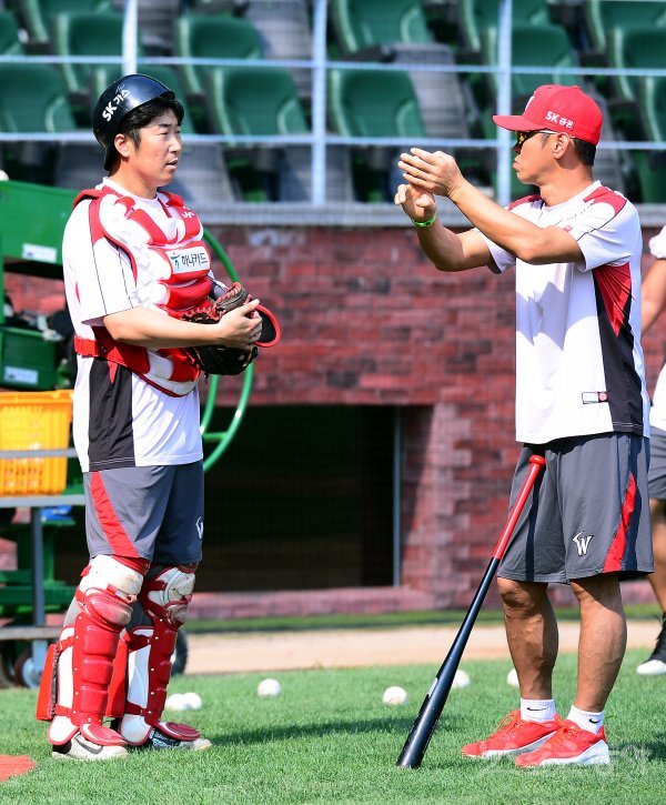 경기 전 SK 박경완 코치가 이성우와 이야기를 나누고 있다.