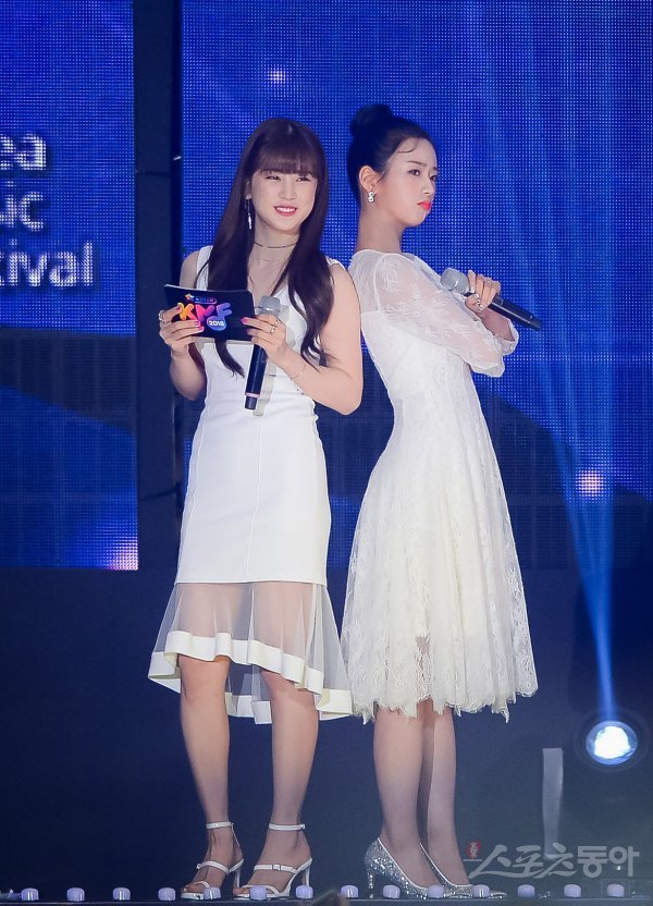 에이핑크의 박초롱과 윤보미(오른쪽)가 2일 서울 고척스카이돔에서 열린 ‘케이스타 2018 코리아 뮤직 페스티벌’에서 진행을 하고 있다.