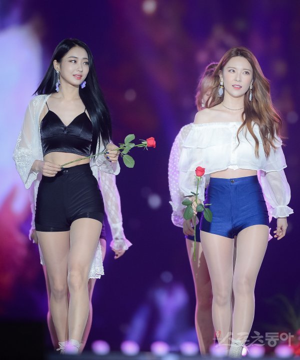 나인뮤지스 경리와 혜미(오른쪽)가 2일 서울 고척스카이돔에서 열린 ‘케이스타 2018 코리아 뮤직 페스티벌’ 플라워 카펫에 참석하기 위해 입장하고 있다.