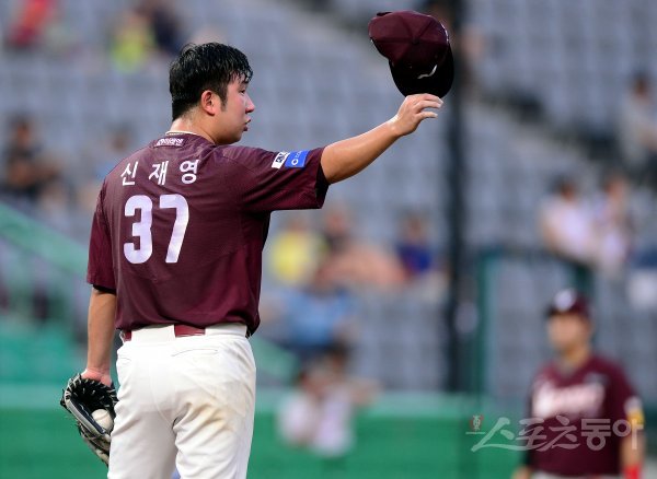 3회말 1사 1루에서 SK 한동민의 타구를 호수비로 아웃시킨 이정후를 향해 넥센 선발 신재영이 고마움을 표현하고 있다.