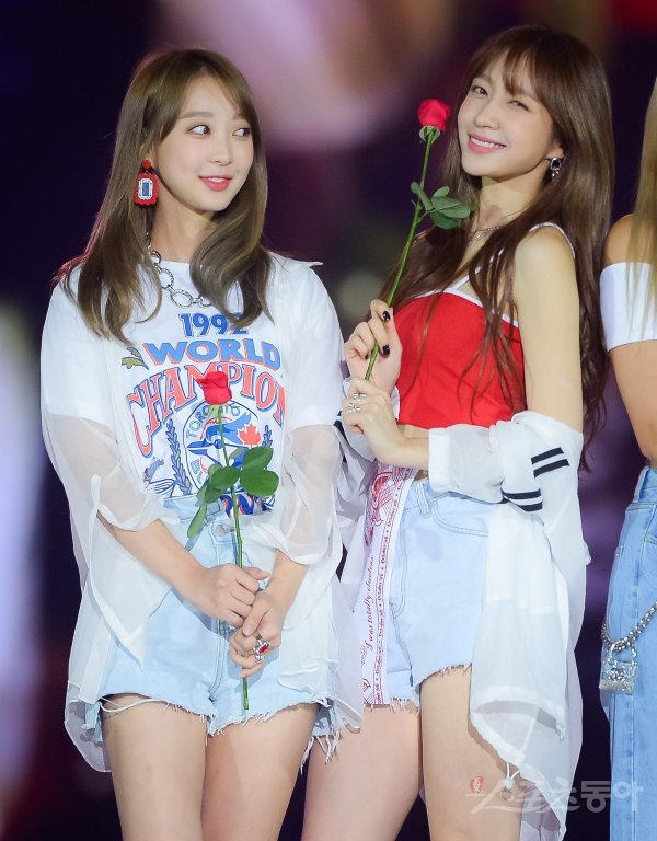 EXID 하니(오른쪽)가 2일 서울 고척스카이돔에서 열린 ‘케이스타 2018 코리아 뮤직 페스티벌’ 플라워 카펫에서 포즈를 취하고 있다.