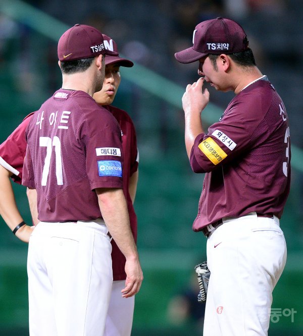 5회말 2사에서 SK 이재원에게 몸에 맞는 볼을 허용한 넥센 선발 신재영이 교체되고 있다.