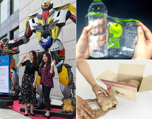현대백화점 킨텍스점 정문 앞 광장의 정크아트 로봇, 에코 절취선을 적용한 GS25의 PB 음료 ‘유어스 청사과워터’, CJ오쇼핑의 친환경 종이 포장재(왼쪽부터 시계 방향으로). 유통업계가 소비자들의 눈길을 끄는 친환경 아이디어를 선보이고 있다. 사진제공|현대백화점·GS25·CJ오쇼핑