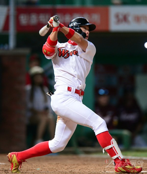 5회말 무사에서 SK 노수광이 넥센 선발 신재영을 상대로 우월 역전 솔로 홈런을 쏘아 올리고 있다.