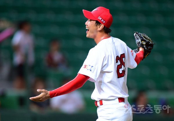 7회초 1사 1루에서 넥센 장영석의 타구를 노수광이 호수비로 아웃시키자 SK 선발 김광현이 환호하고 있다.