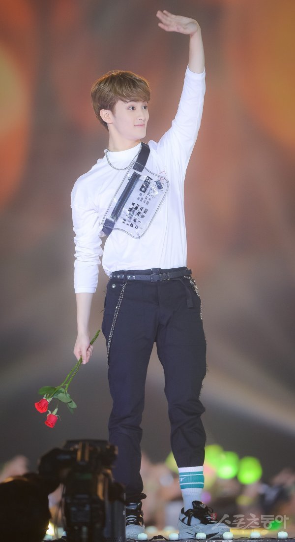 NCT127 마크가 2일 서울 고척스카이돔에서 열린 ‘케이스타 2018 코리아 뮤직 페스티벌’이 끝난 후 팬들을 바라보며 손인사를 하고 있다.