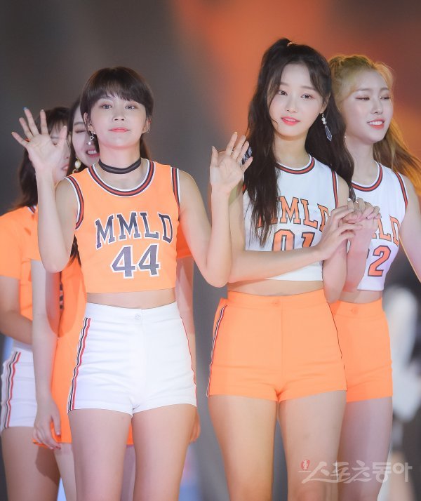 모모랜드 혜빈과 연우(오른쪽)가 2일 서울 고척스카이돔에서 열린 ‘케이스타 2018 코리아 뮤직 페스티벌’이 끝난 후 팬들을 바라보며 미소를 짓고 있다.