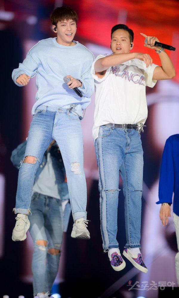 비투비 이민혁과 프니엘(오른쪽)이 2일 서울 고척스카이돔에서 열린 ‘케이스타 2018 코리아 뮤직 페스티벌’에서 열정적인 무대를 펼치고 있다.