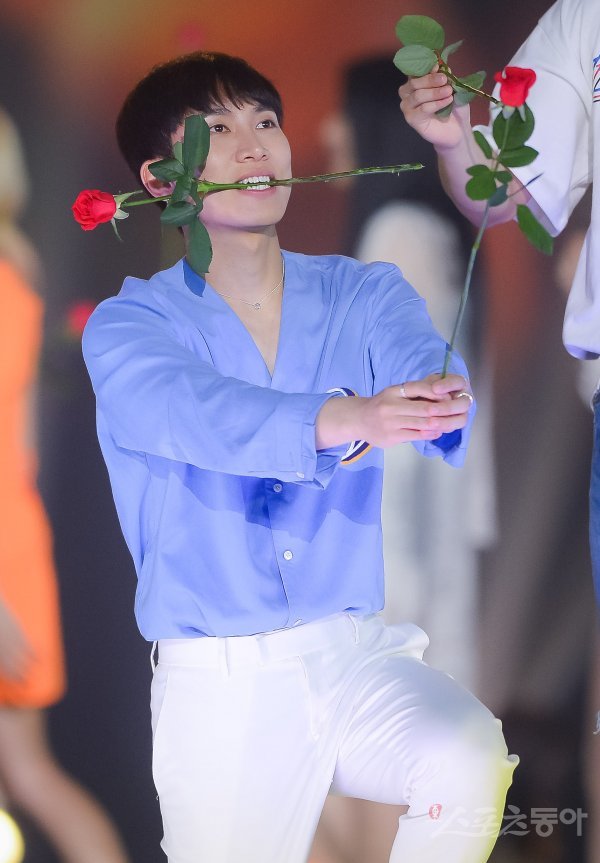 비투비 서은광이 2일 서울 고척스카이돔에서 열린 ‘케이스타 2018 코리아 뮤직 페스티벌’이 끝난 후 장미꽃을 들고 팬들을 향해 퍼포먼스를 벌이고 있다.