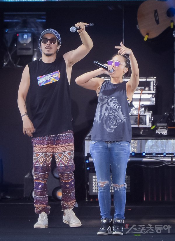 가수 타이거JK와 윤미래(오른쪽)가 3일 서울 잠실 보조경기장에서 열린 ‘싸이 흠뻑쇼 SUMMER SWAG 2018’에서 열정적인 무대를 펼치고 있다.