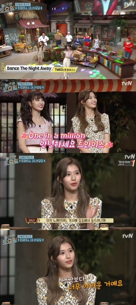 이날 사나는 "'놀라운 토요일' 방송을 봤냐. 어땠느냐"는 질문에 "저희 노래인데도 가사를 들으려고 하다 보니까, '늘'과 '는'이 너무 헷갈리더라"고 대답했다.