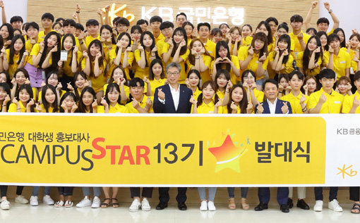 KB국민은행이 3일 서울 여의도본점에서 ‘KB캠퍼스스타’ 13기 발대식(사진)을 열었다. KB국민은행 브랜드와 상품, 서비스를 대외적으로 홍보하고 참신한 마케팅 아이디어를 제안하는 대학생 홍보대사로 이번 13기는 8월부터 12월까지 활동한다. 우수 활동자에게 KB국민은행 입행 지원 시 서류전형 면제가 제공된다. 우수 활동팀에는 장학금 지급과 해외금융탐방 프로그램 등 다양한 혜택이 주어진다.