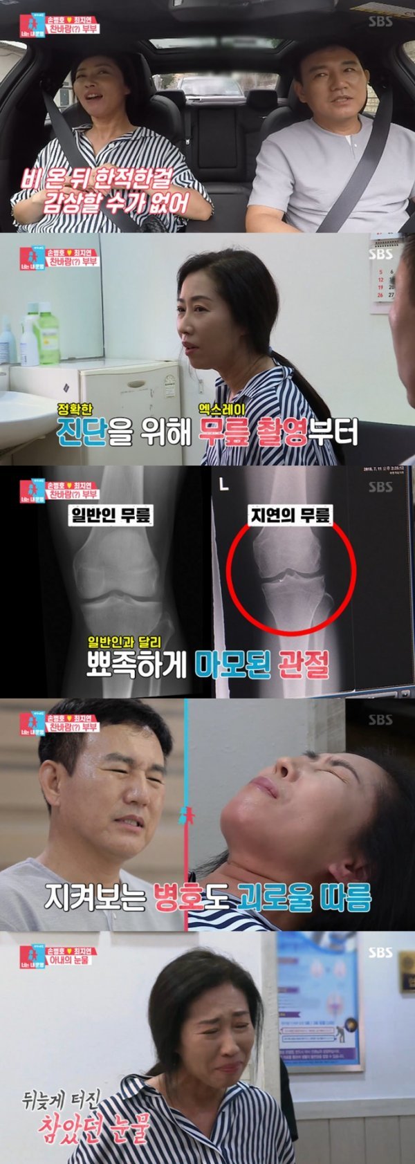손병호-최지연 부부가 향한 곳은 병원. 진료를 받으러 들어간 최지연은 “아침에 일어나면 잘 걷질 못하겠다”라고 말했다. 최지연은 “2001년도에 무릎 수술을 했다. 보통 무용수들은 수술 뒤에 다른 직업을 선택하는데 나는 천직이라 생각하며 계속 춤을 췄다. 금년에도 계획이 많은데 치료받지 않으면 연습을 할 수가 없다”라고 말했다.