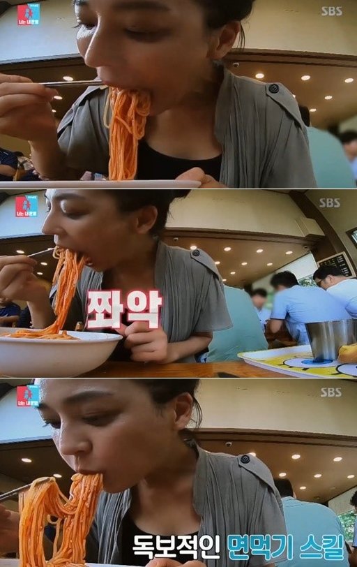 우아하고 도회적인 이미지의 한고은. 하지만 이날 방송에서 보여준 모습은 소탈하기 그지없었다. 화장기 없는 민낯으로 등장한 한고은은 거침없이 국수 먹방을 선보였다. 남편과 함께 간 식당에서 국수 세 그릇을 주문한 한고은은 푸드 파이터처럼 국수를 흡입(?)했다.