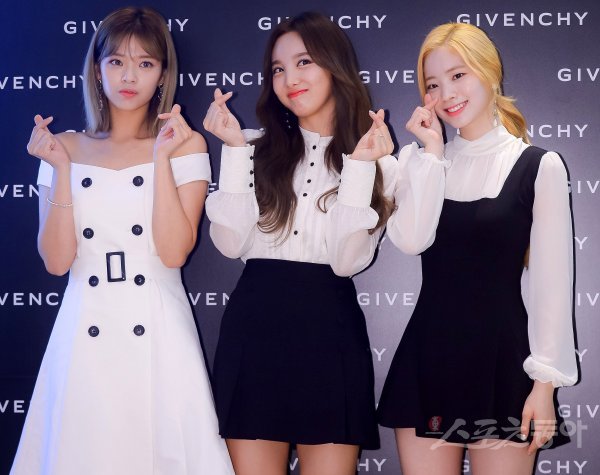 트와이스 정연과 나연, 다현(왼쪽부터)이 7일 서울 서대문구 신촌로 현대백화점 신촌점 지방시 뷰티 매장에서 열린 럭셔리 꾸뛰르 브랜드 지방시 뷰티 국내 2호점 오픈 기념 포토타임에서 포즈를 취하고 있다.