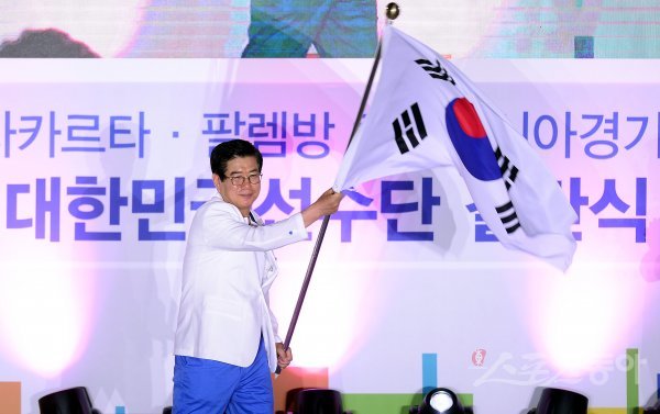 2018 자카르타-팔렘방 하계 아시안게임 대한민국 선수단 결단식 7일 오후 서울 방이동 올림픽공원 SK핸드볼경기장에서 열렸다. 김성조 선수단장이 단기를 흔들고 있다.