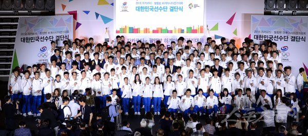 2018 자카르타-팔렘방 하계 아시안게임 대한민국 선수단 결단식 7일 오후 서울 방이동 올림픽공원 SK핸드볼경기장에서 열렸다. 아시안게임 선수단이 기념촬영을 하고 있다.