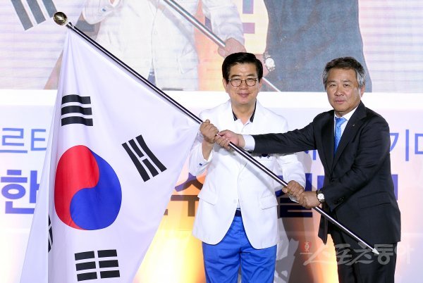 2018 자카르타-팔렘방 하계 아시안게임 대한민국 선수단 결단식 7일 오후 서울 방이동 올림픽공원 SK핸드볼경기장에서 열렸다. 이기흥 대한체육회장이 김성조 선수단장에게 단기를 전달하고 있다.