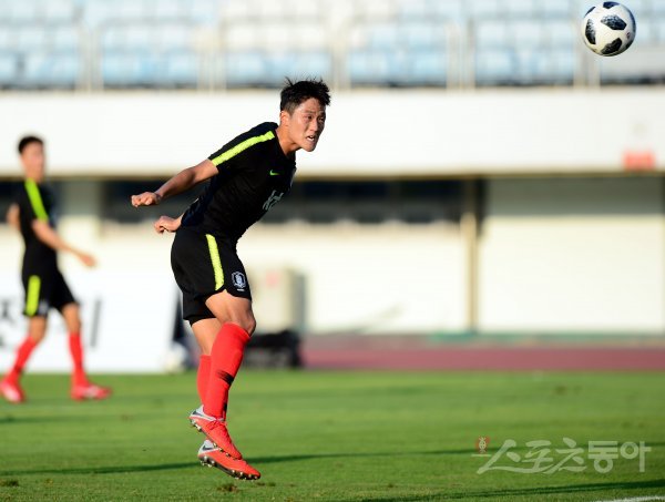 축구 대표팀 나상호 헤딩슛을 성공시키고 있다.