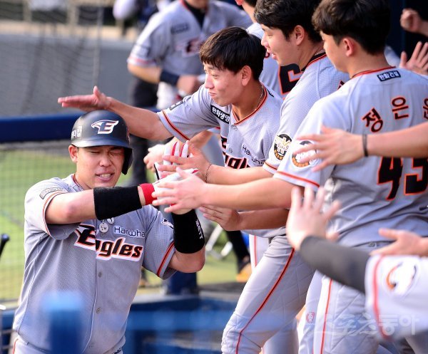 2회초 무사 1,2루 한화 지성준이 선제 좌중월 스리런 홈런을 날리고 그라운드를 돌아 홈인해 있다.