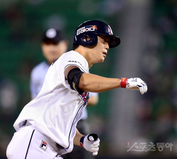 4회말 1사 두산 류지혁이 동점을 만드는 우중월 솔로 홈런을 날리고 그라운드를 돌며 하이파이브 하고 있다.