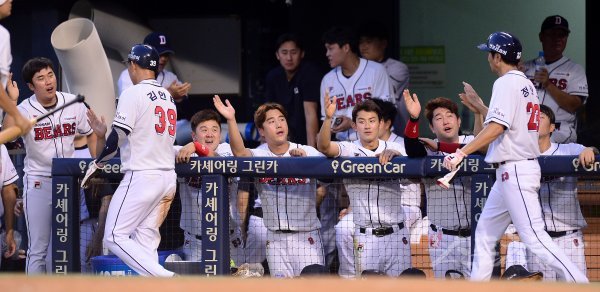 2회말 2사 2,3루 두산 조수행의 2타점 적시타 때 득점한 김인태와 정진호가 더그아웃에서 하이파이브 하고 있다.