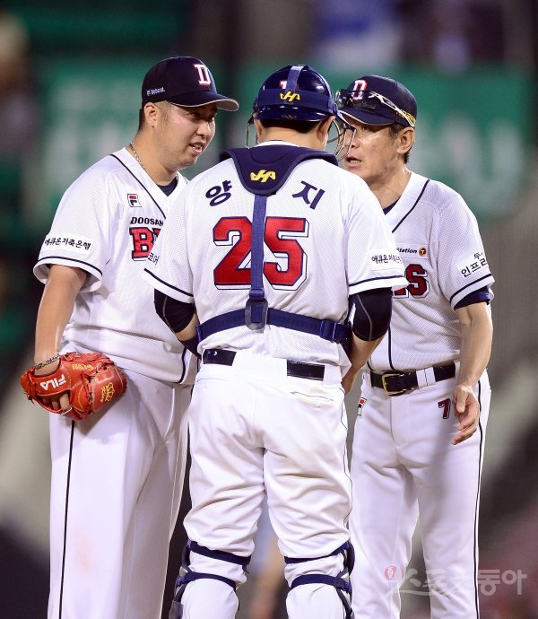 3회초 2사 만루 상황에서 두산 이강철 코치가 마운드에 올라 유희관과 이야기 하고 있다.