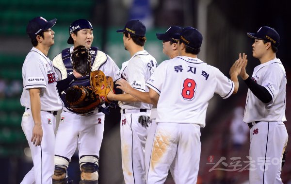 6-4 역전승을 거둔 두산 선수들이 하이파이브 하고 있다.