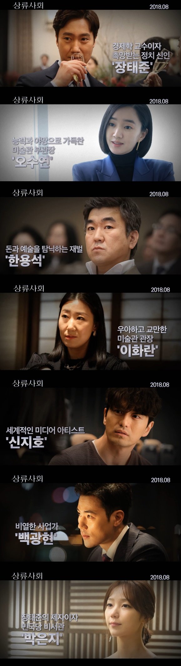 뿐만 아니라 세계적인 미디어 아티스트 ‘신지호’는 ‘오수연’이 야심 차게 준비하는 미술관 재개관전에 합류할 것을 예고해 새로운 기대감을 높인다. 이어 비열한 사업가 ‘백광현’은 ‘장태준’과 함께 일하는 젠틀함과 반전 있는 광기까지 선보여 호기심을 자아낸다. 더불어 장태준의 제자이자 민국당 비서관 ‘박은지’는 열정적으로 일하는 신인 정치인 ‘장태준’을 보좌하며 선망의 눈길을 보내는 모습을 통해 정치계에 자리 잡고자 하는 야심을 느끼게 한다. 이처럼 이번 캐릭터 영상에는 각기 다른 인물들이 ‘상류사회’를 원하는 다양한 욕망을 한눈에 볼 수 있어 기대감을 증폭시킨다.