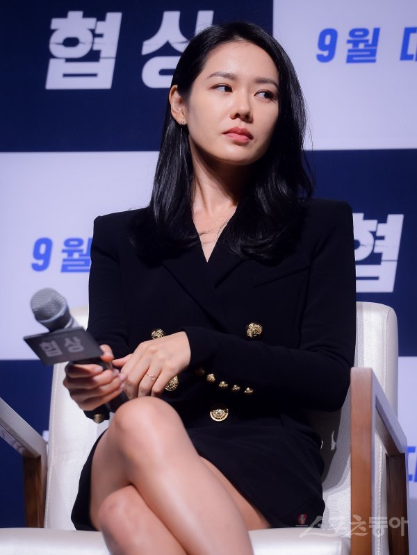 배우 손예진이 9일 서울 강남구 압구정로에 위치한 CGV 압구정에서 열린 영화 ‘협상’ 제작보고회에서 취재진의 질문을 듣고 있다.