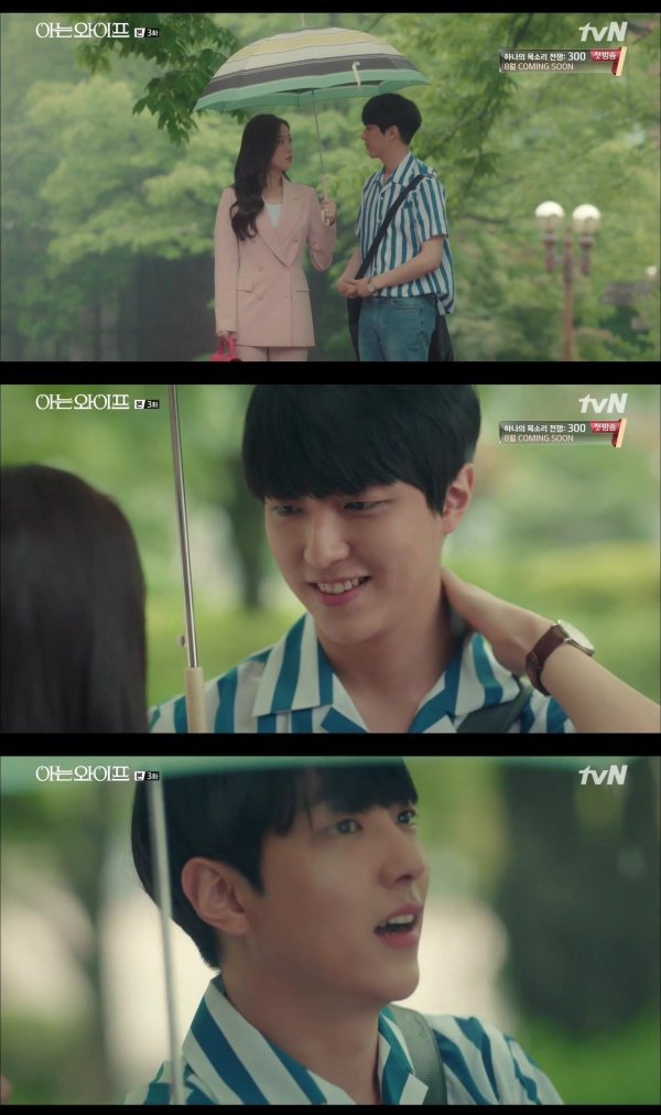 tvN 수목드라마 ‘아는 와이프’에서 매력만점 훈남 대학생 정현수로 분한 이유진의 활약은 이제부터 시작. 8일 방송된 ‘아는 와이프’ 3회에서 정현수(이유진)는 첫 등장했다. 쏟아지는 빗속에서 정현수는 처음으로 모습을 드러낸 것. 이혜원(강한나 분)의 우산 속으로 들어온 그는 싱그러운 미소와 함께 “죄송합니다. 가시는 데까지만 같이 좀 쓸게요. 오늘 옷이 젖으면 안 되는 날이라” 능청스러운 어조로 말하며 예사롭지 않은 등장을 알렸다.
