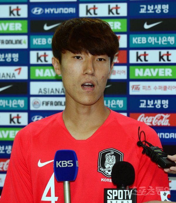 훈련에 앞서 축구 대표팀 김진야가 인터뷰를 하고 있다.