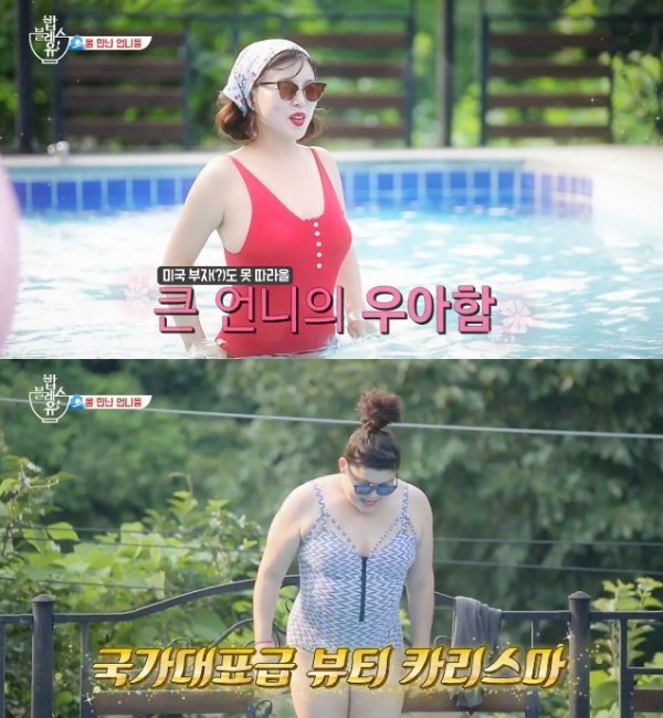 최화정은 빨간 수영복을 입고 아름다운 자태를 드러냈다 송은이는 “미국 부자 같다”고 너스레를 떨었다. 이영자 역시 수영복 몸매를 드러냈다. 특히 이영자는 수준급의 수영실력을 선보이며 놀라움을 자아냈다. 하지만 튜브에서는 역시 몸개그였다. 이렇게 네 사람은 즐겼고, 준비된 홍학 튜브는 혹사 당했다.