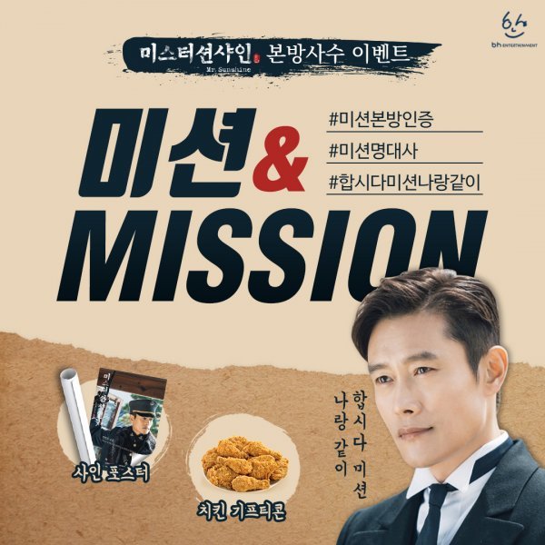 이벤트 상품은 배우 이병헌의 친필 싸인이 담긴 미스터 션샤인 포스터(10명)와 치킨 기프티콘 (5명)이며, 본인의 SNS 계정에 게시물을 올리고 해시태그를 달면 자동으로 응모된다.
