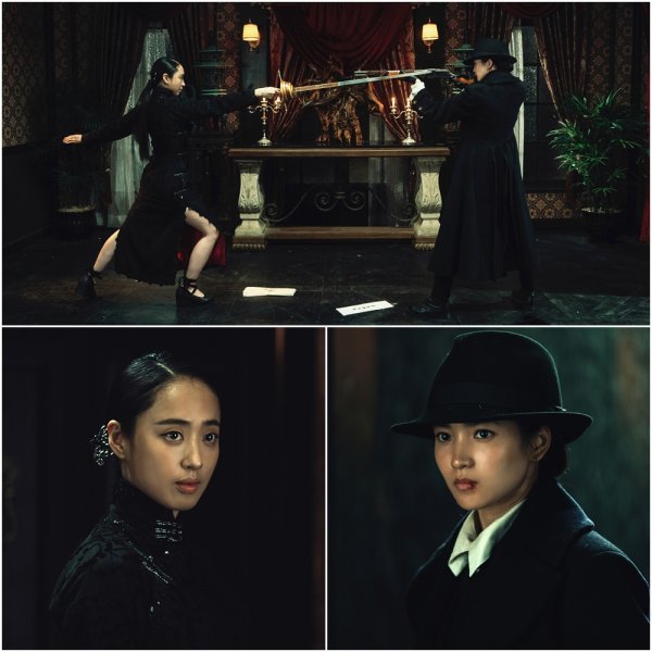 이와 관련해 방송이 끝난 후에도 ‘역대급 장면’이라고 극찬을 받는 김태리와 김민정의 ‘1분 엔딩 女女 투 샷’이 공개됐다. 변복을 하고 신사모까지 장착한 채 날카롭게 조준 자세를 갖춘 애신과 치파오를 입은 채 펜싱 자세를 취하고 있는 히나의 폭발적인 ‘카리스마 대면’이 안방극장을 숨죽이게 했다.