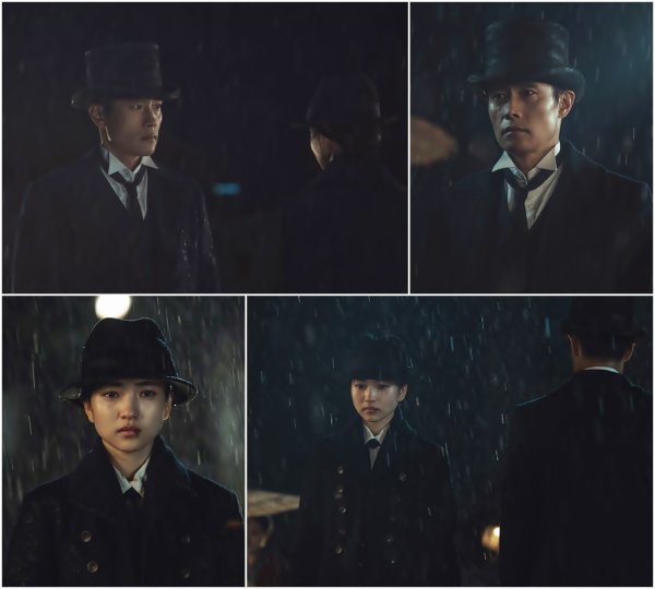 이와 관련 12일 방송될 12회분에서는 이병헌과 김태리가 추적추적 내리는 빗속에서 서로를 스쳐 지나가는, 안타까운 장면이 펼쳐진다. 극중 비에 젖은 거리를 걸어가던 유진이 맞은편에서 다가오는 변복한 애신을 발견하는 장면. 마주 걸어오는 애신을 알아본 유진은 걸음을 멈춰 애신을 가만히 바라보고, 애신 또한 유진을 발견, 눈물 어린 눈길로 쳐다본다. 이어 잠시 걸음이 멎었던 두 사람이 서로를 향해 가까이 다가가더니 결국 말 한마디 건네지 못한 채로 비껴가는 것. 유진과 애신이 서로에게서 떼지 못하는, 애절한 모습이 그려지면서 궁금증을 고조시키고 있다.