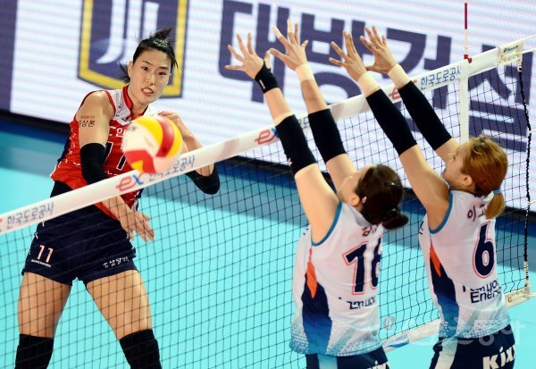 KGC 인삼공사와 GS칼텍스의 결승전 경기에서 KGC인삼공사 최은지가 GS칼텍스 블로커를 피해 스파이크를 날리고 있다.