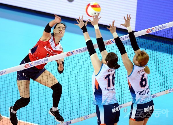 KGC 인삼공사와 GS칼텍스의 결승전 경기에서 KGC인삼공사 최은지가 GS칼텍스 블로커를 피해 스파이크를 날리고 있다.