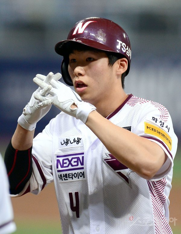 1회말 무사 2루 넥센 김혜성이 선제 1타점 우전 안타를 치고 1루에서 세리머니를 하고 있다.