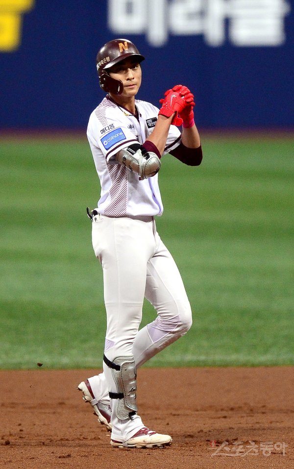 1회말 무사 넥센 이정후가 좌전 2루타를 치고 2루에서 세리머니를 하고 있다.