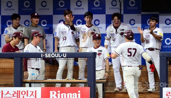4회말 2사 1루 넥센 송성문이 중월 투런 홈런을 날리고 그라운드를 돌아 홈인해 장정석 감독과 박병호의 축하를 받고 있다.