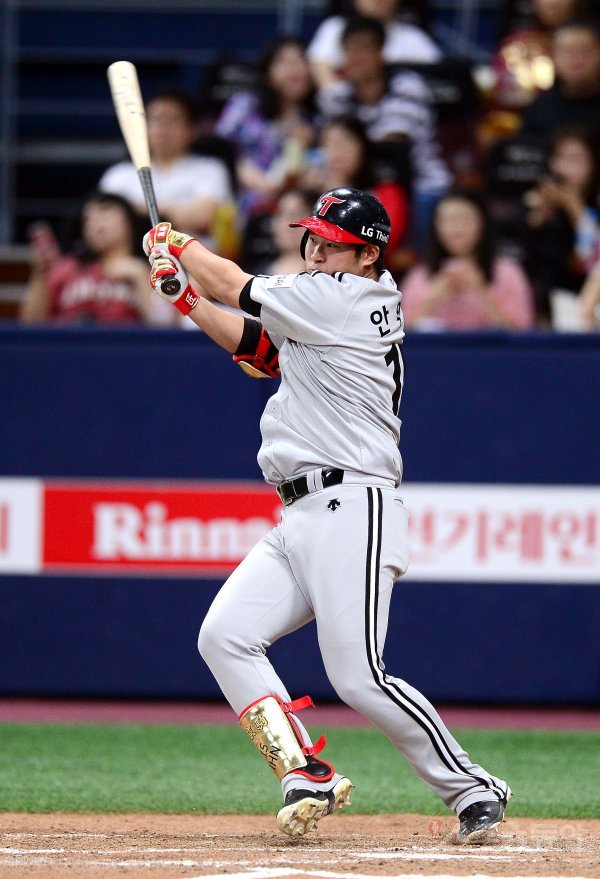 4회초 1사 1,2루 LG 안익훈이 동점 적시타를 치고 있다.