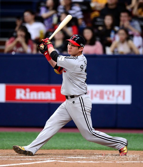 4회초 2사 1,2루 LG 오지환이 역전 1타점 적시타를 치고 있다.