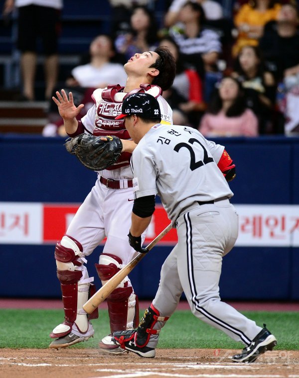 3회초 1사 2루 넥센 포수 주효상이 LG 김현수의 플라이볼을 잡으려 하고 있다.