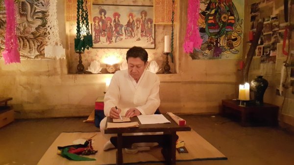 필립에게 죽음을 예고하고 살길을 알려주는 의안점잼이 역할로 분한 김응수는 양초들과 신을 모시는 그림들로 가득한 점집에서 범상치 않은 포스를 풍기며 자리에 앉아 용한 점쟁이의 분위기를 물씬 풍긴다.