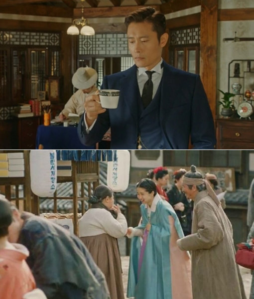 ‘미스터 션샤인’은 시대극이라는 상업적 한계의 선을 절묘하게 넘나들며 PPL 효과를 톡톡히 보고 있다. 이병헌이 ‘가배’로 불리는 커피를 마시는 장면(위쪽)과 ‘불란셔 제빵소’ 문구가 나오는 장면에 각각 달콤커피와 파리바게뜨의 간접광고가 등장한다. 사진출처|tvN ‘미스터 션샤인’ 방송 화면 캡처