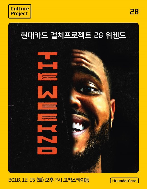 현대카드가 28 번째 컬처프로젝트의 주인공으로 선택한 아티스트는 위켄드다. 현대카드 관계자는 “위켄드는 전 세계 대중음악의 새로운 흐름으로 급부상하고 있는 PBR&B의 현재를 상징하는 아티스트”라며 “이번 현대카드 컬처프로젝트는 국내 팬들이 위켄드의 음악세계를 직접 만날 수 있는 뜻 깊은 자리가 될 것”이라고 말했다.