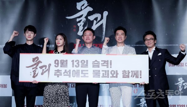 배우 최우식과 걸스데이 혜리, 허종호 감독, 배우 김명민, 김인권(왼쪽부터)이 16일 서울 광진구 롯데시네마 건대입구에서 열린 영화 ‘물괴’ 제작보고회에 참석해 포즈를 취하고 있다.
